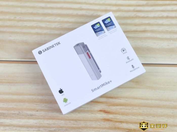 塞宾智麦无线蓝牙麦克风的包装盒正中印有麦智的英文,左上角是塞宾的品牌Logo,中间是产品的渲染图,右上角则是塞宾智麦无线蓝牙麦克风的获奖记录,包装盒的背面介绍了厂家相关信息。