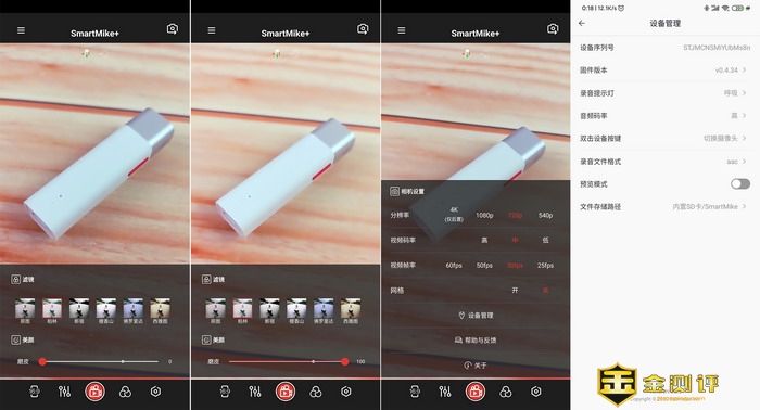 另外麦智APP还有美颜功能,可以磨皮,这个功能可以直接在拍摄视频就进行美颜,后期可以减少很多处理的功夫,这个功能也是非常的好。在麦智APP里最右侧的设置里,可以设定相机分辨率,最高到4K,不过仅有后置摄像头可以,视频码率可以调节,帧率也可以调节,还能开启网格线辅助视频拍摄。在设备管理中,还能设定录音提示灯的闪烁方式,调节音频码率,设置录音文件的格式等等,功能非常的强大。
