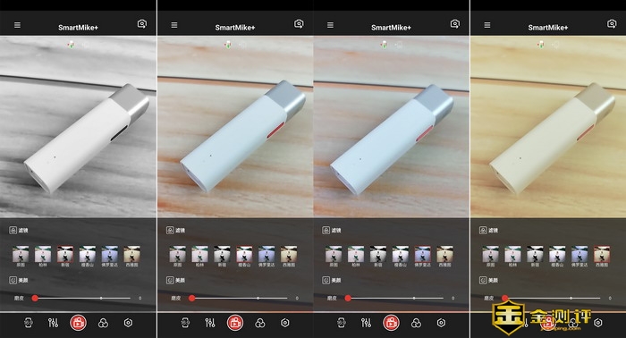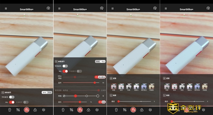 塞宾智麦无线蓝牙麦克风下方菜单的第二个是参数调节,自动模式下可以调节的较少,智能开关手机麦克和塞宾智麦无线蓝牙麦克风的麦克,切换到专业模式后,功能就丰富了,除了可以调整麦克建议,还能调节监听音量,另外下面可以开启智能降噪功能,有4挡可以调节,另外还可以调节混音音量。麦智APP还提供了6种不同的滤镜效果,大家可以看看每一种滤镜的效果对比。