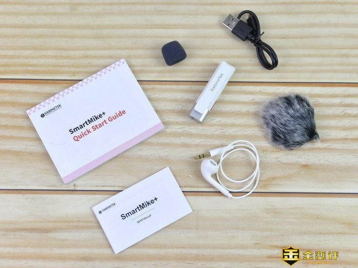 塞宾智麦无线蓝牙麦克风的配件里附带了一条单边耳机,这条耳机可以实时反馈APP的录制效果。