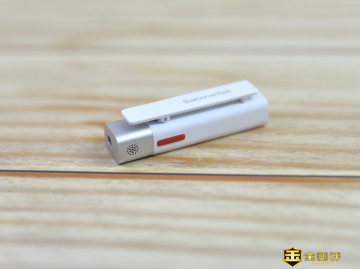 在塞宾智麦无线蓝牙麦克风侧面设计有一个红色的开关按键,开关按键的旁边还有个开孔,这是塞宾智麦无线蓝牙麦克风的全指向高保真收音咪头。
