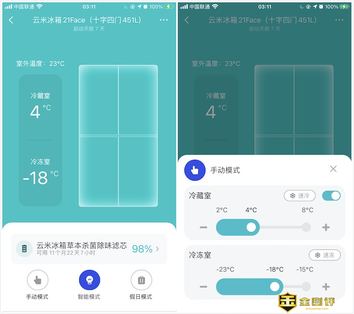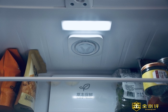 云小鲜系列云米互动大屏451L冰箱冷藏室顶部设计有一个可拆卸替换的草本滤芯,针对大肠杆菌、金黄色葡萄球菌、白色念珠球菌,杀菌率可达99.9%,抑制异味,延长保鲜。实测效果确实不错,每次的剩菜剩饭都会放入冷藏室,作为封闭的空间,混杂了多种多样的气味,但每次把剩菜剩饭拿出来,偶尔再去使用冰箱的冷藏室,打开冰箱门并没有多样的气味扑鼻而来,这应该就是滤芯的功效体现。滤芯的拆卸非常简单,根据滤芯上标识的箭头方向,经过旋转就能够轻松完成拆装。