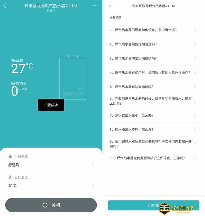 云米作为和米家深入集成的一个智能品牌,旗下很多智能家电都支持接入米家进行使用,这款云米互联网燃气热水器A1也不例外,可以结合米家APP使用,联网之后能够远程查看热水器的水温和模式等状态,同时也可以远程开关机或者预约定时,用起来比较方便。