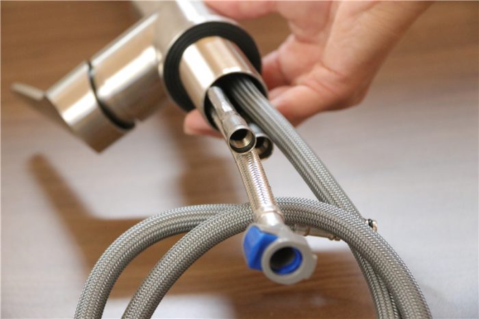 在水龙头的尾部我们可以看到尾部的管道了,包括了进水管,出水管,以及洗涤软管。其中洗涤软管的接口为快接口,将水管对插就可以了。怎么区分呢?官方使用长短不同来做了区分,较短的金属管为热水管,较长的金属管为冷水管,带有快插接口的则是混合水管。