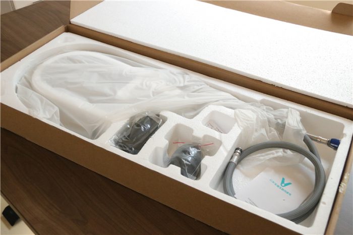 打开包装可以看到这款云米不锈钢抽拉式水龙头的平躺在泡沫的凹槽内,相关的配件也有专属的凹槽,这样保证了运输中的安全。配件都有哪些呢?一起来看下。