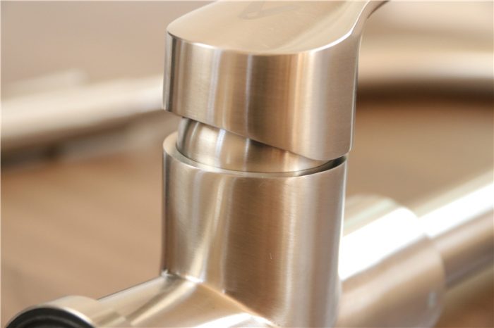 这是这款水龙头的手柄,全不锈钢材质,边缘非常的光滑,没有任何的毛刺。在手柄上面还使用激光镭射工艺设计了一个云米的LOGO,反光的情况下可以看得比较清晰,这样也增加了品牌的宣传度。至于手柄的反馈力度由于采用了西班牙优质赛道陶瓷阀芯,个人在使用中觉得非常顺滑,很有质感。