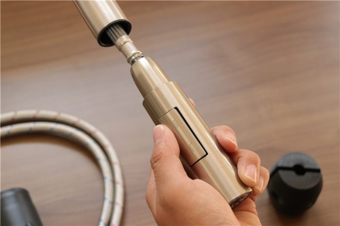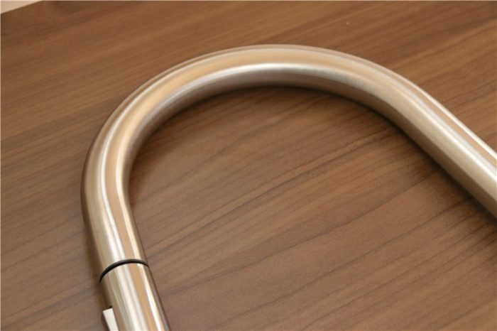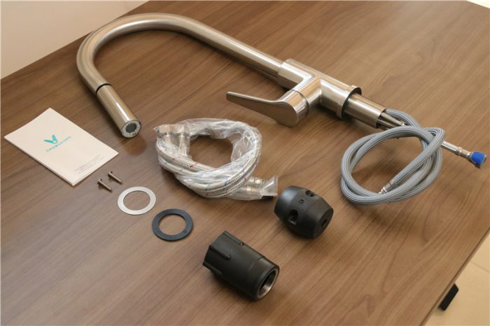 对于一款水龙头来说,配件无需太多,抽拉是的水龙头应该会增加配重,我们来看下吧。除了不锈钢抽拉式水龙头本体之外,还为用户配置了橡胶垫片,不锈钢垫片,锁紧螺套,配重,螺钉,热水进水管(红丝)和冷水进水管(蓝丝)。接下来再看下水龙头的细节方面。