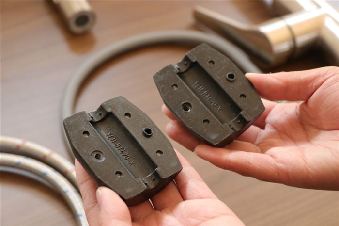 这是它的配重块,很有分量,分为大小相等的两个板块,居中位置的凹槽方便固定在出水管上面的,当我们抽拉水龙头的时候,通过它可以实现自动回缩。