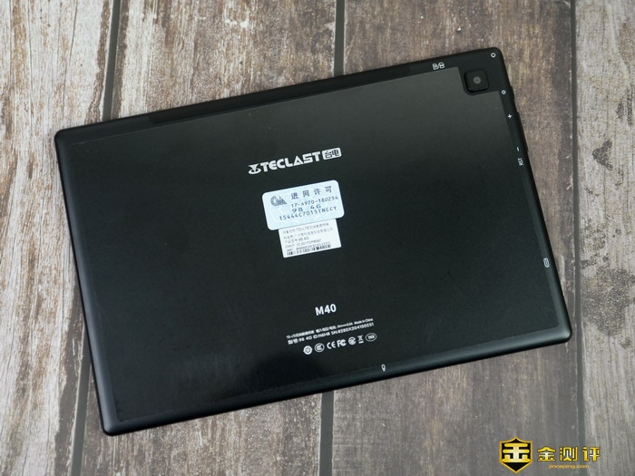 台电M40平板电脑的背面也贴有一张保护膜,可以有效保护背壳不会被刮蹭到。在背面的保护膜上,贴有进网许可等标签。在机身的背面,对于侧面的各个按键插孔都有对应的图标示意,方便查看。