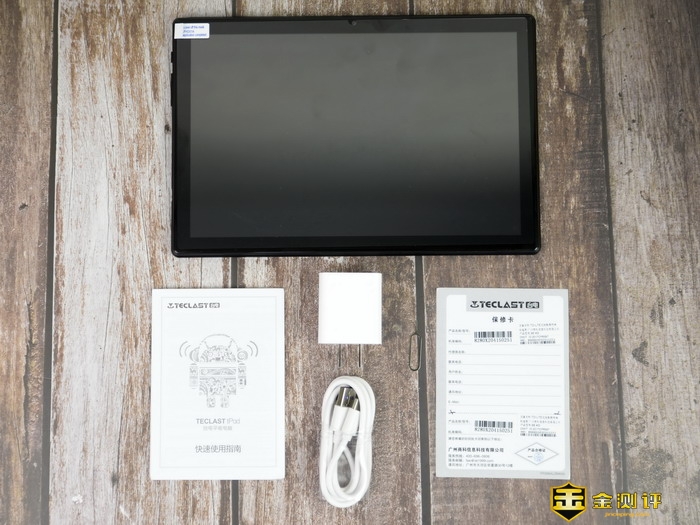 台电M40平板电脑的全家福包含有:台电M40平板电脑本体,数据线,电源适配器,SIM顶针,使用说明书和保修卡。