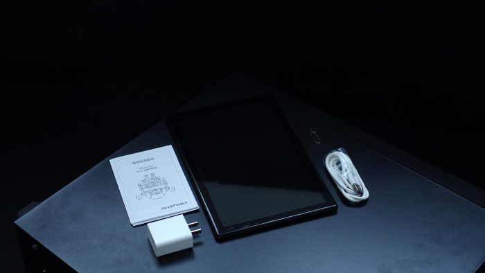 迫不及待地到了开箱环节,打开包装盒后,仔细倒腾一下包装盒,会发现台电M40平板电脑的所有配件,其中含有:快速使用指南×1、产品保修卡×1、数据线×1、SIM卡针×1、电源适配器×1、台电M40主机×1。