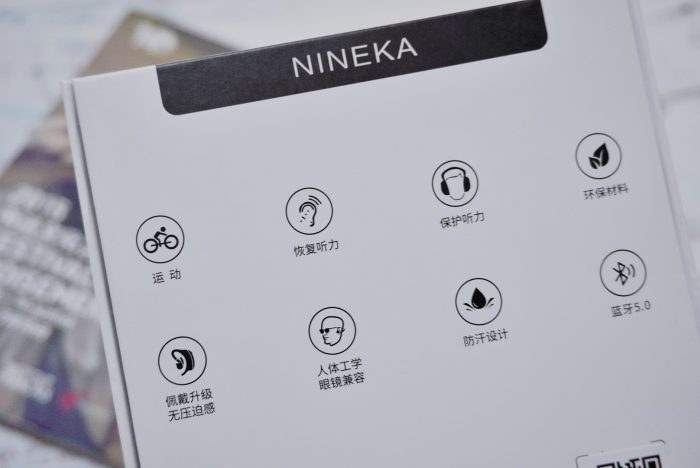 背面标注了产品的各项特色功能,包括蓝牙5.0,保护听力,防汗设计,人体工学眼睛兼容,恢复听力等。