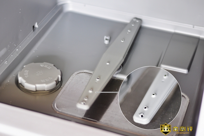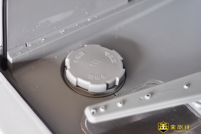 软水盐的最大用途就是软化水质,保护洗碗机和餐具。右侧没有盖子的是排水孔,自带可拆卸滤网,洗碗后的残渣和废水从此处排除机具。