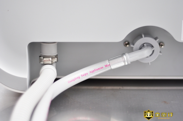机身背部下侧是电源线,在左侧有两个水管,最左侧的是排水管,开口朝下;旁边的是进水管,其中进水管为外螺旋设计,并且开口朝后,具有过滤网,很容易分辨。