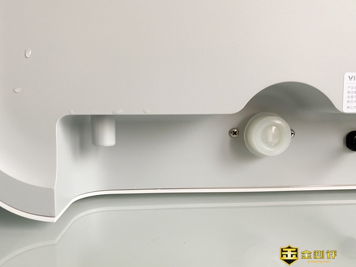 底部左侧有2个水路接口,左侧的是排水口,右侧的是进水口。这款云米免安装台面洗碗机Sugar A1,这里可以连接水管上水,但同时也支持人工水箱注水。