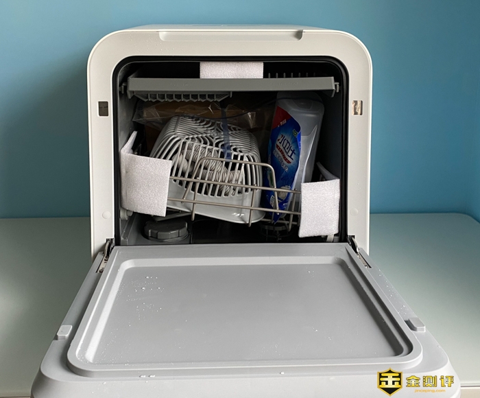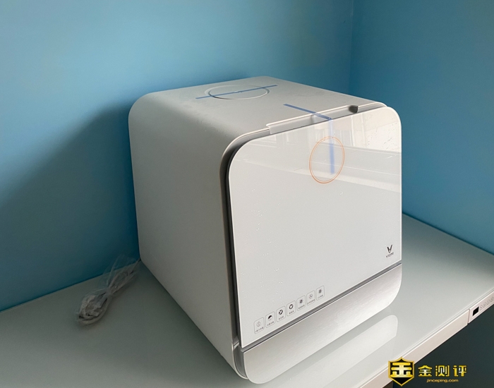 云米免安装台面洗碗机Sugar A1通体基本白色,在箱门和顶部有胶条固定,防止运输中的滑动。