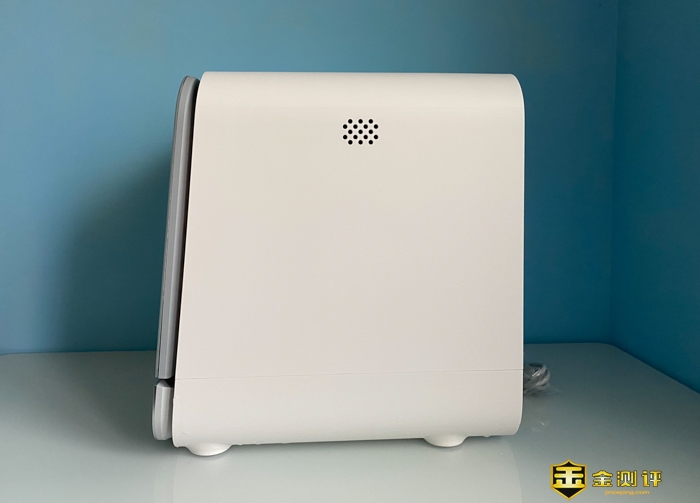 从侧面看,机体的前面略微斜着的,这样的设计应该有其独特的考虑。左侧顶部有个透气孔,洗碗时产生的热气会从这里散出,另外一侧则没有。