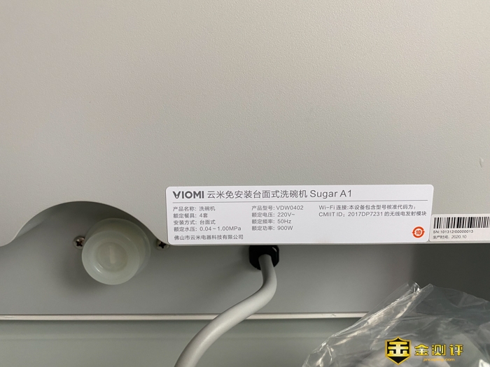 背板有铭牌,云米免安装台面洗碗机Sugar A1,额定餐具是4套,实际说明是4-6套,功率最高是900W,带有WiFi连接模块。