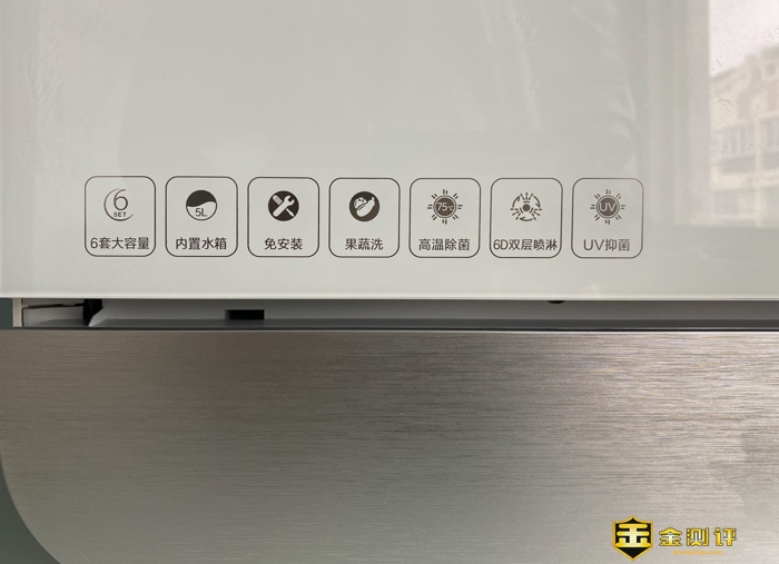 在下部左侧,有产品的特色功能,包括6套大容量,内置水箱,免安装,果蔬洗,高温除菌,6D双层喷淋,UV抑菌的字样。