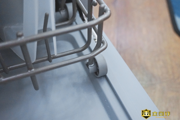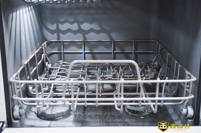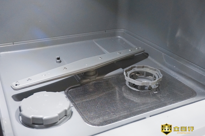 机身的右侧有一个通风孔,用于排出内部潮湿的空气。内部的碗篮分两层,洗碗机底部有过滤食物残渣的过滤器,还有软水盐的加注口。