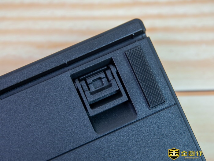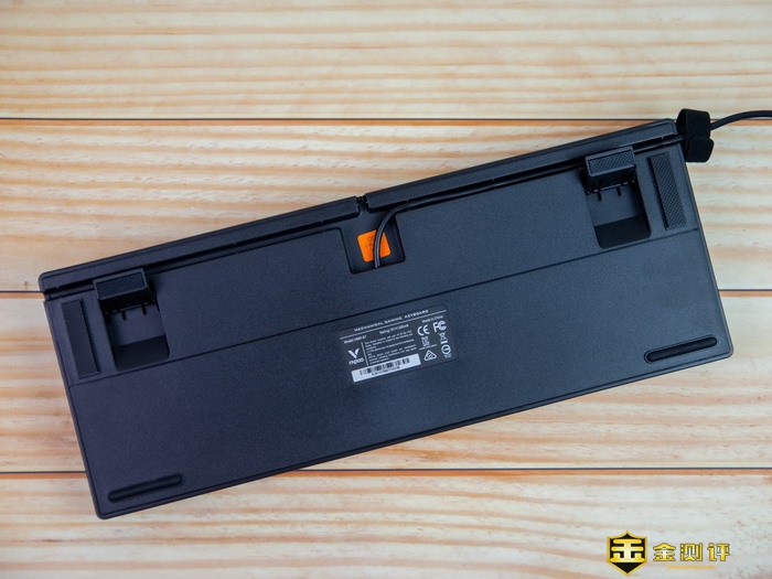 雷柏V860-87游戏机械键盘的四个边角都设计有防滑胶垫,但是左右两个边角设计有两段式的脚撑。