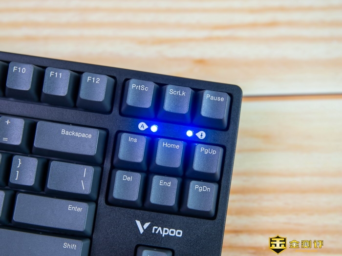 雷柏V860-87游戏机械键盘在方向键的上方设计有雷柏的品牌Logo,并且在上方设计了2个工作指示灯,分别用来显示Caps和ScrLk的工作状态,键盘表面磨砂工艺处理,所以手感和质感都相当的不错。
