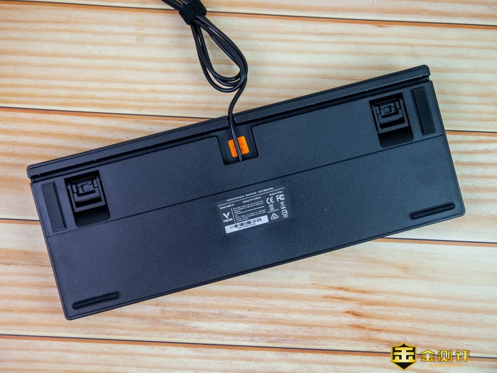 雷柏V860-87游戏机械键盘的背面可以看到一个很贴心的设计,就是三向导向槽设计,我们的电脑主机摆放位置和笔记本接口的布局都是不确定的,所以如果没有导向槽,有时候线材的走位就会很不顺手,这个三向导向槽的出现,基本上不管什么方向的,都可以轻松搭配,变得顺手。