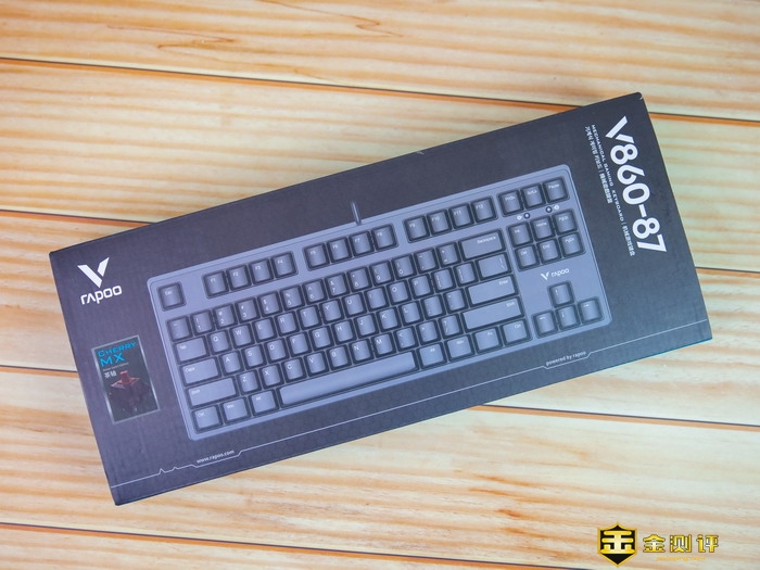 雷柏V860-87游戏机械键盘的包装盒尺寸要明显小于标准104键按键布局的,包装盒的左上角是雷柏的品牌Logo,左侧标明了采用的轴体,是樱桃原厂茶轴,中间则是键盘的渲染图,右侧是型号和布局后缀,包装盒的背面通过多国语言介绍了键盘相关的功能特点。