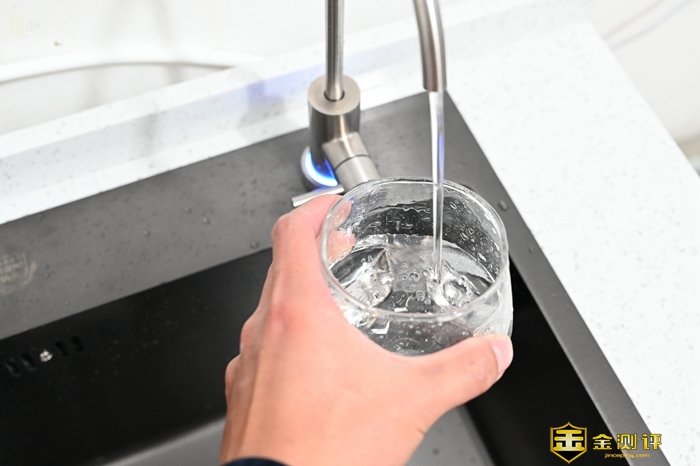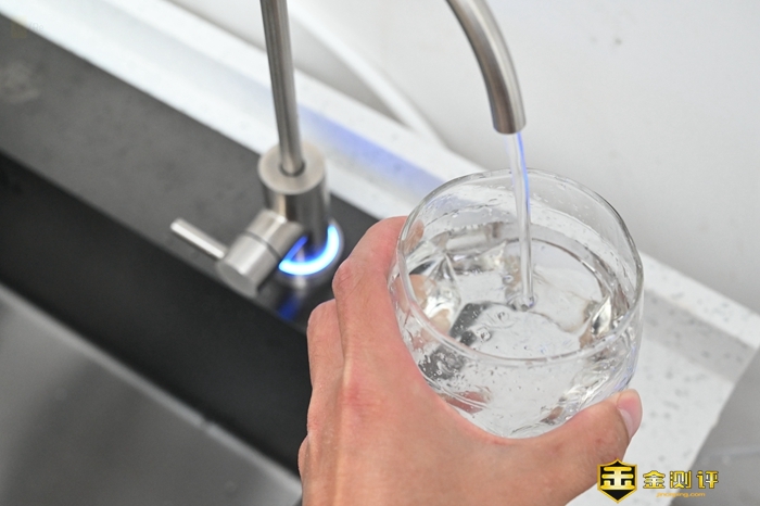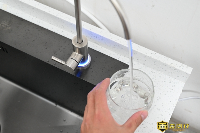 最后在确认各个水管都连接好之后,就可以将小蓝调通电了,第一次使用的时候,还需要先冲洗一下,也就是放一段时间水,这个过程净水器也会主动提示,就是蓝色灯闪烁,并且在完成后可以看到水龙头上面的LED灯会停止闪烁转为常亮,这就表示净水器已经可以正常工作,出水已经可以直饮,并且口感也很不错了,净水龙头出的水可以直接喝了。
