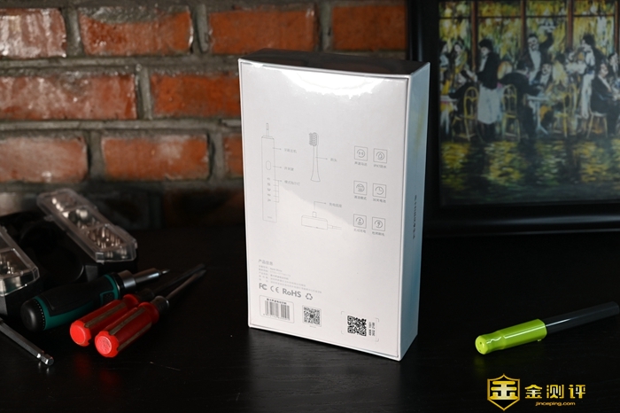 这款电动牙刷具有一种声波去渍的特性,在牙齿美白方面,有着比较不错的表现。Shiny电动牙刷的包装比较简约,上面简单勾勒了这款牙刷的外形,同时也简要概括了这款牙刷的一些功能特点。