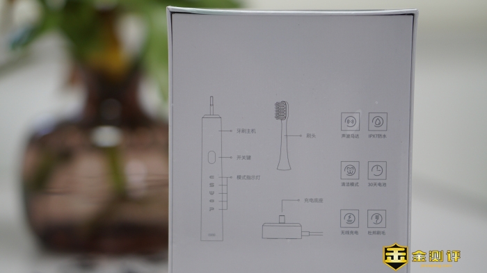 背面是这款南卡Shiny 电动牙刷各个部件的一个图解,可以大致的了解一下牙刷的基本情况,而旁边则是这款牙刷的一些功能特色,声波马达、IPX防水、无线充电、杜邦刷毛等等。
