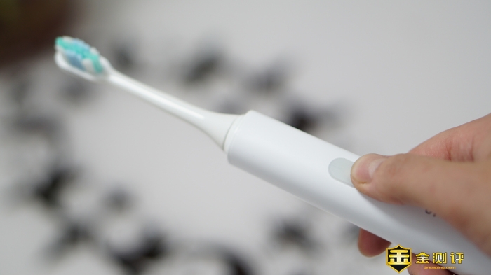 牙刷主机握感舒适,质感机身,整体造型并没有使用常见的圆柱形,而是略微圆弧的方形,符合亚洲人手握习惯,精巧纤细,通过抛光处理,更具质感与时尚气息,大拇指位置正好是牙刷的电源开关,操作起来非常的顺手。
