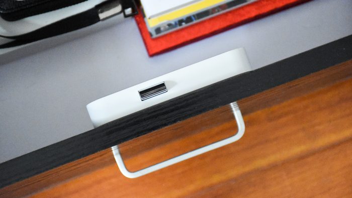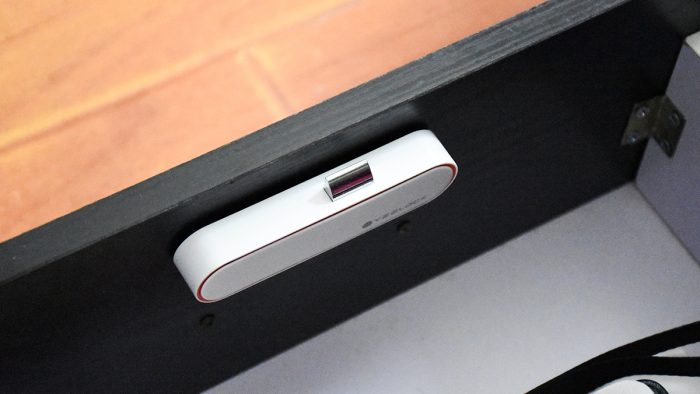 机身右侧接缝的位置预留有扬声器开孔,顶部设计了一个橙黄色的提手,便于在某些场景下悬挂携带,和前面一款抽屉锁的配色有些类似。