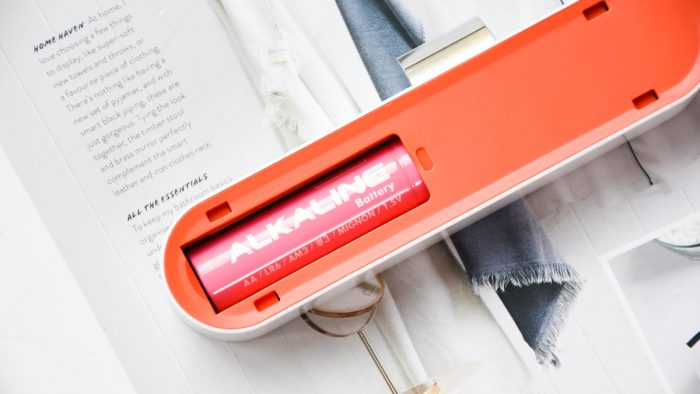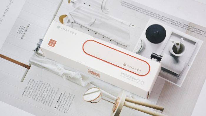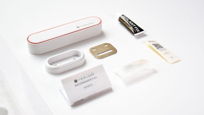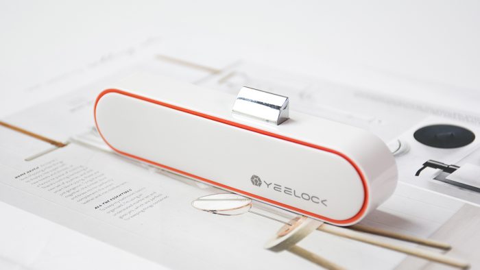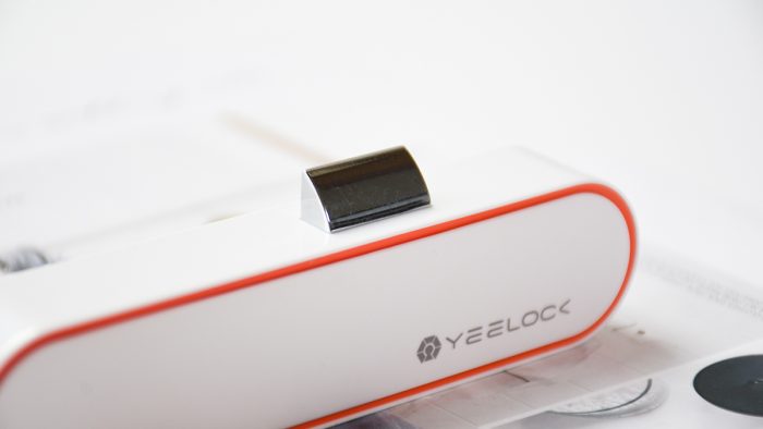 锁子整体采用白色塑料材质外壳,顶部电池仓盖子下方为橙黄色,通过一节五号电池供电。盖上盖子以后形成一个悬浮式的结构,看上去科技感十足,右下角还印有灰色的YEELOCK品牌Logo。