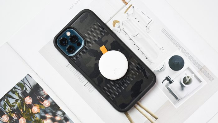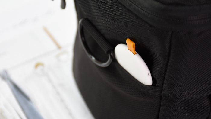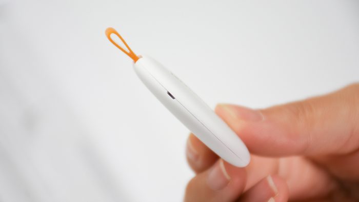 防丢器的外观设计小巧圆润,比一般大衣的纽扣稍大一圈,表面是细微的类肤质感,触感温润舒适,不过貌似有些不耐脏。正面有下方还设计了一枚按键。
