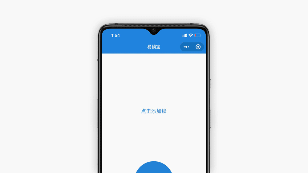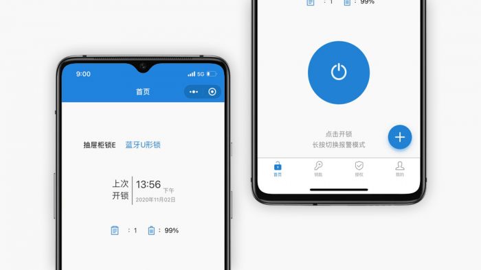 小程序中的功能也比较简单直观,首页显示有上次开锁时间、开锁次数、电量剩余情况,下面一个圆形的电源按键单击就可以完成开锁,长按可以开启报警模式。