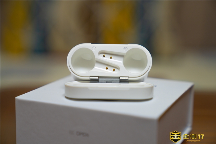 充电盒盒口左右两侧分别有“L”、“R”标识,便于将耳机快速定位放入。同时在顶部我们还能看到两颗金属触点,可以供耳机充电使用。