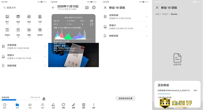设置完毕后,当然可以测试一下,打开文件管理,可以看到手机合计剩余空间为154GB,拍摄照片后,我们查看照片位置为NM存储卡中,批量将手机存储内的视频导入NM存储卡中,速度非常可观。