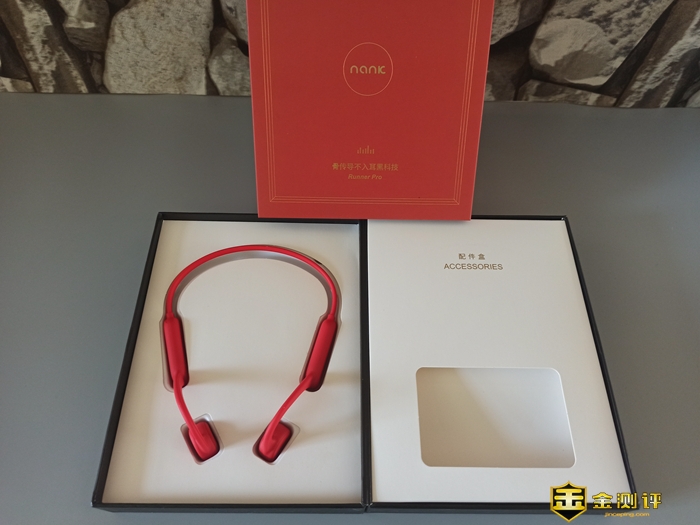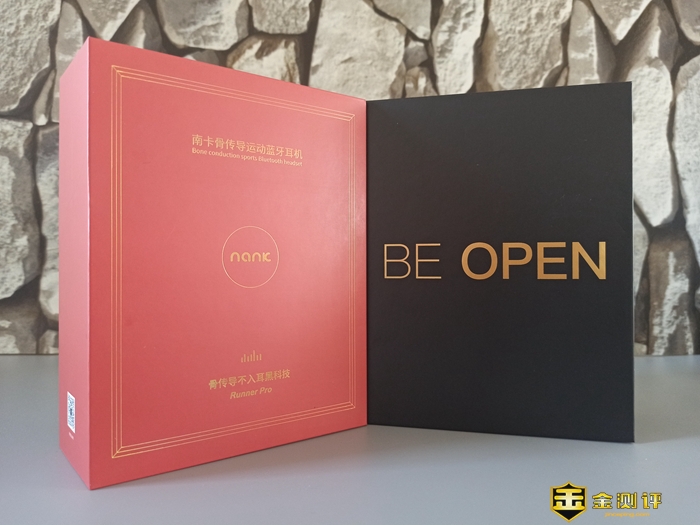 抽拉式的红色外套里边是印有高级黑且印有金色“BE OPEN”字样的精致盒子。双层外套,让这款南卡Runner Pro骨传导运动蓝牙耳机显得格外神秘。