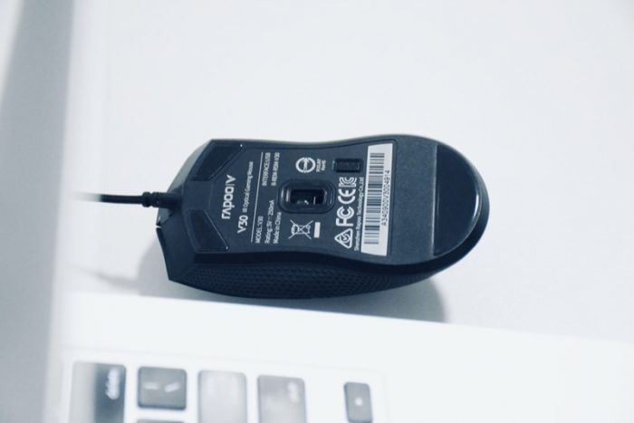 鼠标底部设计有产品的相关参数,和背光模式按键,上面两个角和底部设计有鼠标凸起位,防止鼠标滑动时,底部全部接触桌面。