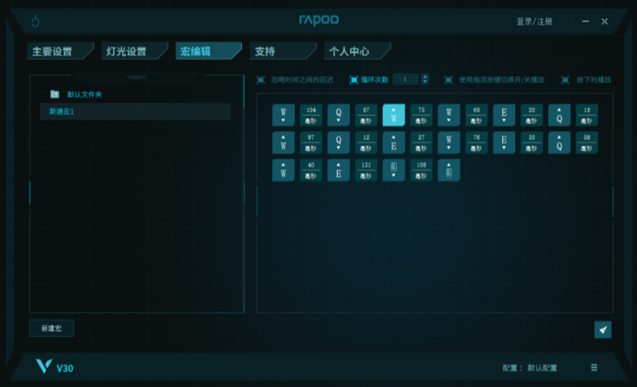 雷柏V30幻彩RGB游戏鼠标在Windows系统上可下载一个驱动程序,可以对鼠标进行详细的自定义设置,同时也可以进行鼠标的固件版本更新。DPI参数、灯光设置、宏编辑等功能可以在驱动上进行设置,并实时同步到雷柏V30幻彩RGB游戏鼠标。Mac电脑没有上述的驱动和操作。