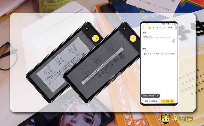 得益于作业帮强大的题库,在使用录题打印时,只需要在手机端拍摄选择拟录取题目,喵喵机APP就会通过OCR识别在线检索,并反馈题目和解析答案,甚至包括相关的知识点和同类题,真的可以做到举一反三。