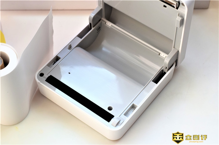按照机身左侧箭头的指示方向轻轻一搓,我们就可以打开机身。机身打开之后,我们可以看到里面装着一卷热敏纸,将热敏纸拿出来可以看到机身的内部。我们还可以看到,整个机身采用卡扣式的方式闭合。