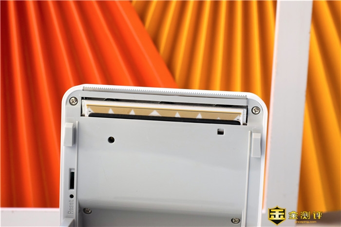 机身内部细节特写。喵喵机P3出纸口有锯齿式裁纸刀,打印完成之后,直接撕下来即可。同时,机身内部的上方一侧还设计有Reset孔,可以通过这个来重置机器。