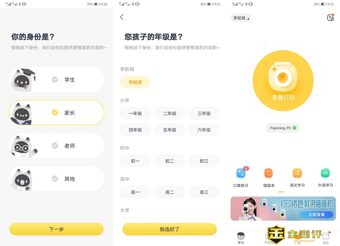 注册登录后,首先是确认使用者的身份,以便于APP提供更精致的内容。家中男宝学前班阶段,这是进行内容筛选后,就可以进入喵喵机APP的主界面。测试了不同的学龄阶段,发现进入二级目录的顺序有所调整,挺人性化的软件交互设计。