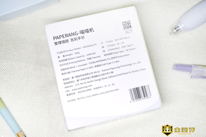 包装背面Slogan——整理错题、告别手抄。下面是产品型号、尺寸、重量等详细的参数,以及喵喵机制造商信息。当然扫描右上角二维码,即刻下载喵喵机配套APP。