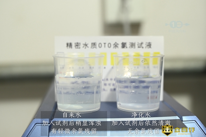 余氯的净化处理也是净水器很重要的任务,因为氯虽然在自来水处理传输的过程中有消毒作用,但是余氯也会和水中有机酸发生反应,产生致癌物质,长期饮用很不健康,而这款净水器就有较强的余氯净化能力,净化前后的水样中滴入余氯测试试剂,可以看出,净化前的水源有轻微的余氯,而净化后的水源则已经将余氯清除干净了。