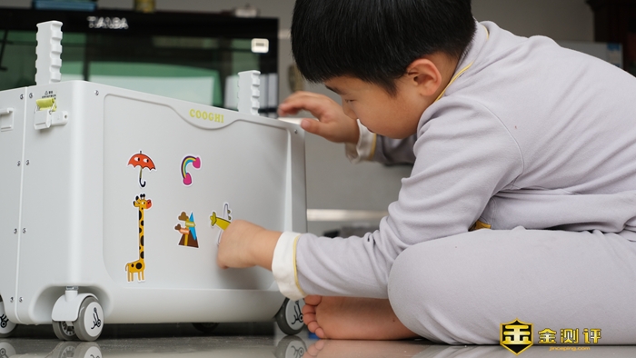 孩子非常喜欢随机附带的个性化卡通贴纸,还没看说明书就自己动手贴了起来,似乎这个旅行箱就是他的新玩具,看到孩子高兴,家长自然更加高兴。