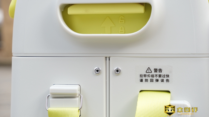 在不使用拉带时,轻轻向上抠动连接扣即可取下拉带头,但收回拉带时务必缓慢松手,避免速度太快拉带头甩到人或箱体造成损伤。