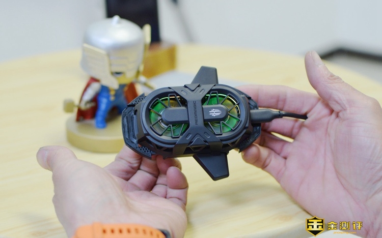 从正面看上去,这款红魔散热背夹的外观有点像即将发射的火箭(就是头有点大,哈哈),左右两侧有双翼的设计,非常有个性;里面设计了双风扇(7叶)风冷降温系统